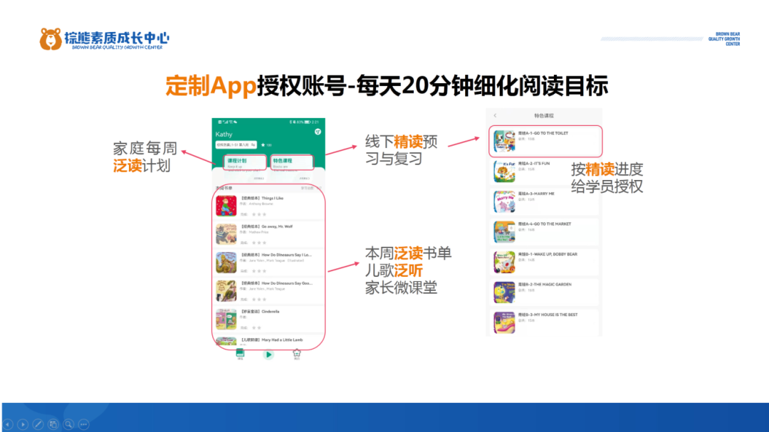 棕熊阅读课程配备700本以上纸质绘本图书+专属定制APP+智能复读机。家长可以随时了解对应课堂教材的精读音频和课程学习任务,搭配精美地纸质绘本,方便家长指导孩子进行预习和复习任务,告别以往在微信群找不到或者漏看老师发音频的情况,孩子们接收老师的输出指导更便捷。